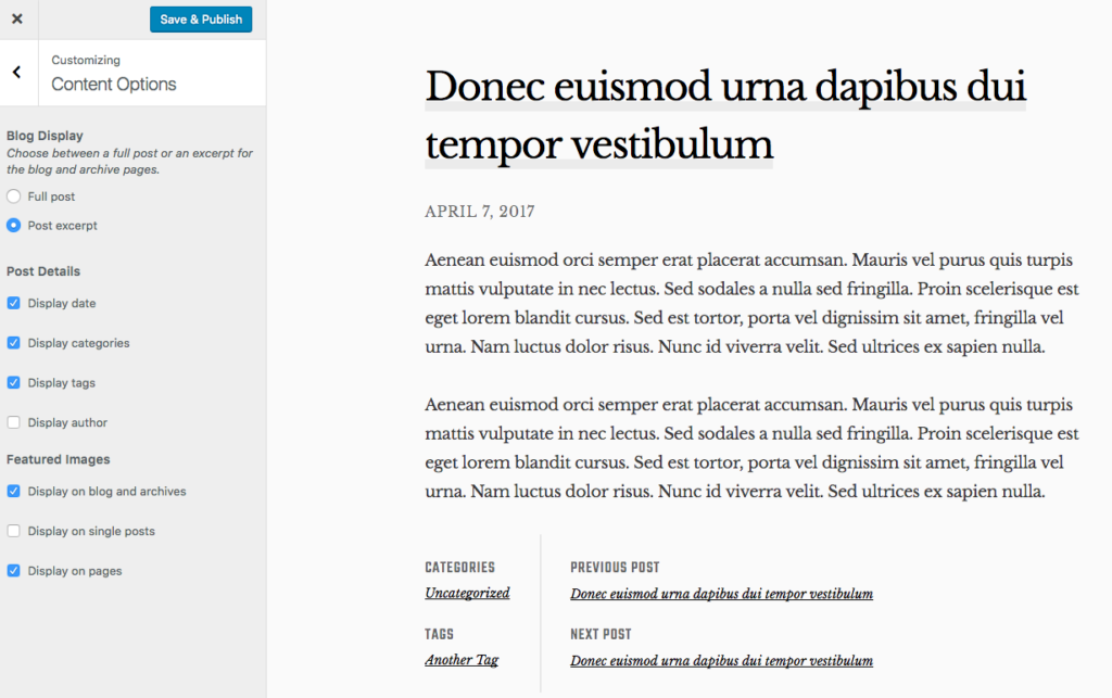 A single post with author and featured image not displayed.[/caption] Note that on our demo site, the "Blog Display" setting is set to "Post excerpt" and not "Full post."