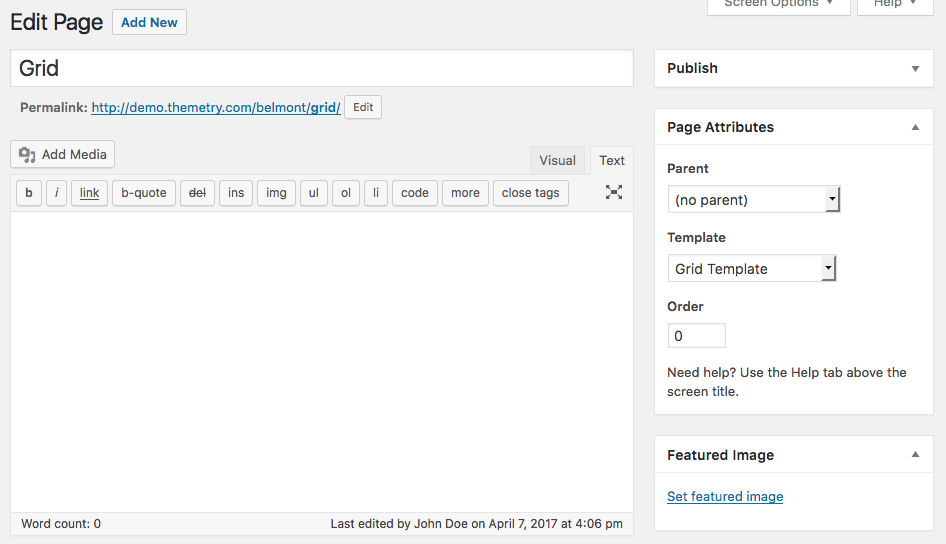 When the "Grid Template" is selected as the page template, it will pull in the content of child pages when used as a homepage section, and formats them in rows of three. Note that the page title or content of the "Grid Template" itself is not displayed on the homepage, just those of child pages. The parent page using "Grid Template" should look like this on the backend. The key is to select "Grid Template" from the list of page templates on the "Edit Page" screen.