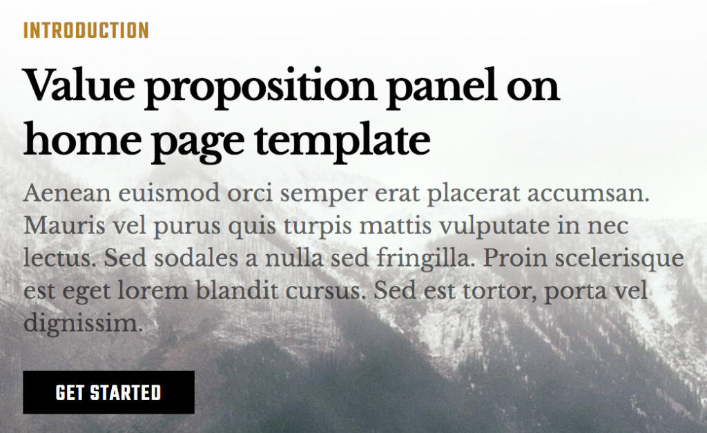 The top hero section of the Belmont theme homepage pulls content from whichever page you set as the "front page" in the previous step. Here's the "front page" content we use on our demo site:<h3>Value proposition panel on home page template</h3>
