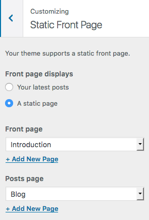 To get started with the homepage setup, you'll need to create two pages in Pages → Add New. One will be designated as your "front page" and the other your "posts page. On our demo site, these pages are called "Introduction" (front page) and "News" (posts page).