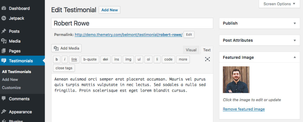 When the "Testimonials Template" is selected as the page template, it will pull in a random selection of two testimonials from the Jetpack Testimonials content type. Here's an example of what one individual testimonial looks like on the backend: